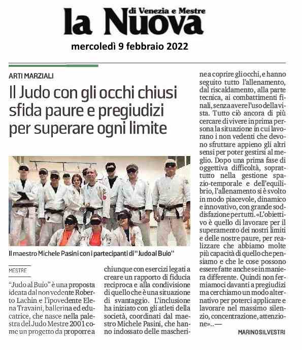Articolo della Nuova di Venezia e Mestre del 9 Febbraio in cui si parla dell’allenamento di judo al buio ideato da Roberto Lachin ed Elena Travaini svoltosi al Judo Mestre 2001 dei Maestri Michele Pasini e Manuela Tadini